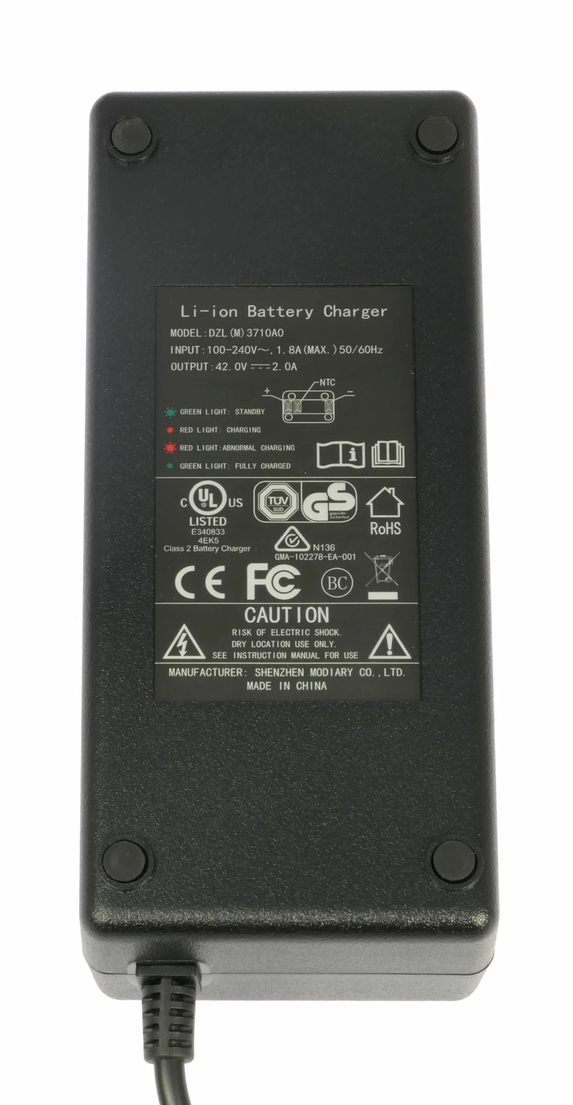 Le chargeur a une tension de sortie habituelle de 42 Volt et un courant de charge de 2A (2,0 ampères).