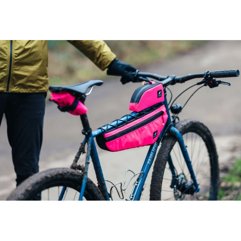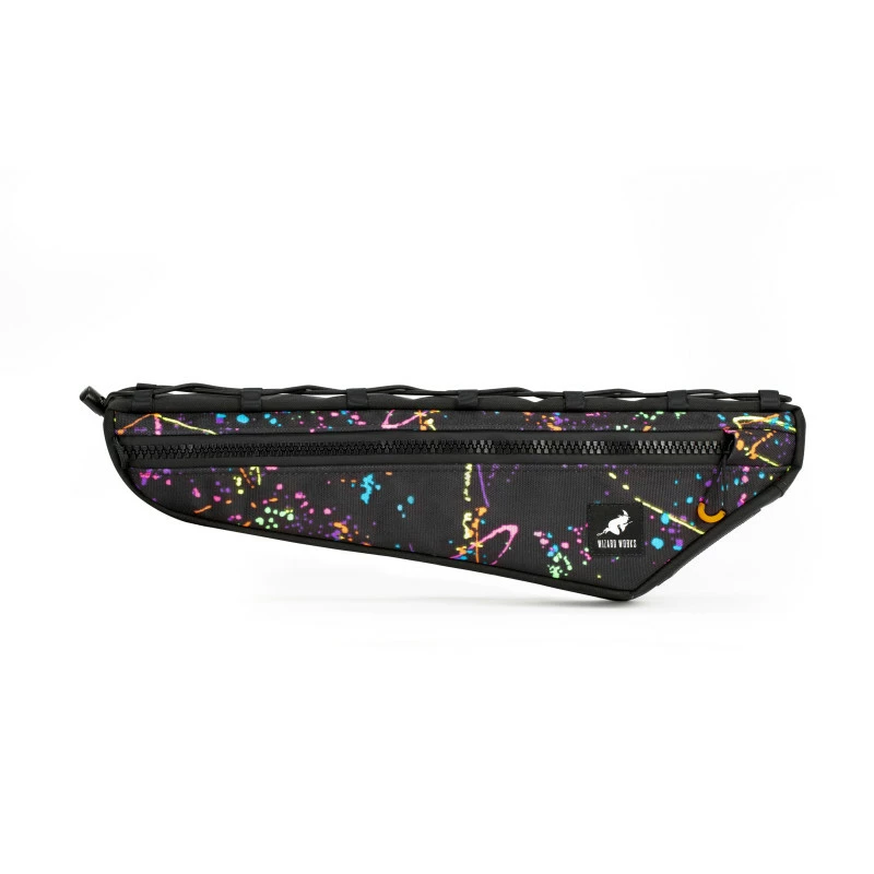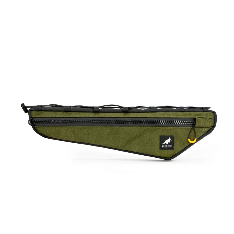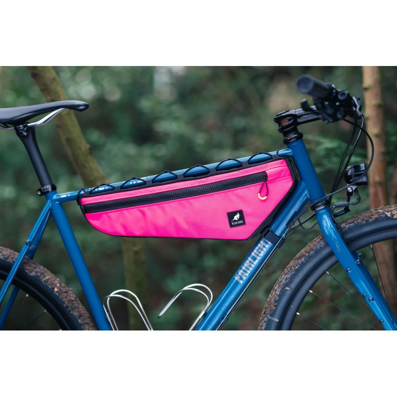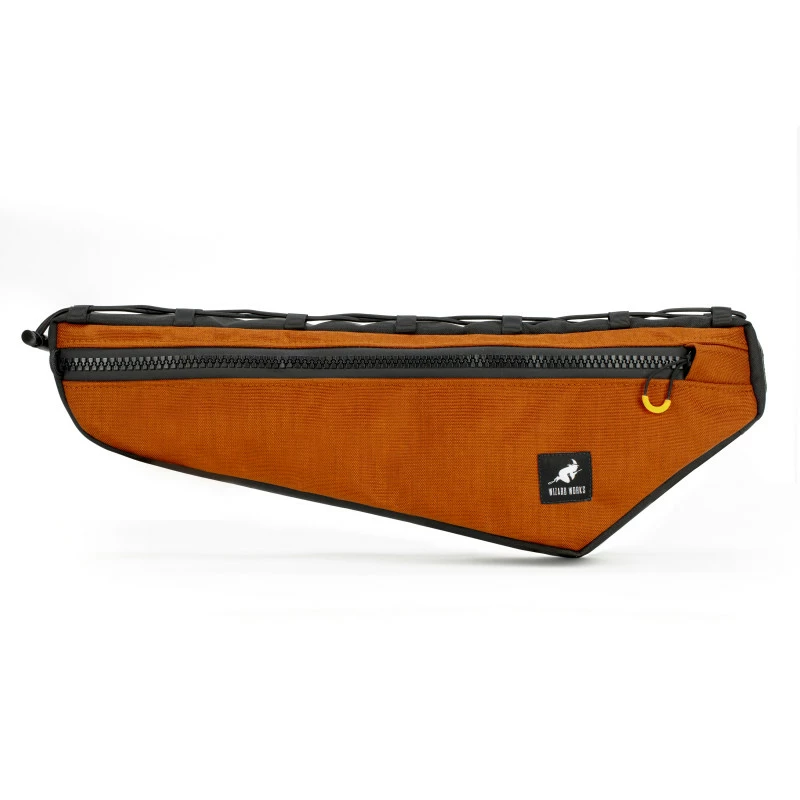 Sacoche de cadre de la marque anglaise Wizard Works. Se fixe à l’aide d’une ficelle et de straps sur le cadre pour un maintien franc. Une sacoche qui permet de mettre de la nourriture et de petits objets lourds. Fermeture robuste pour une ouverture efficace tout en roulant.