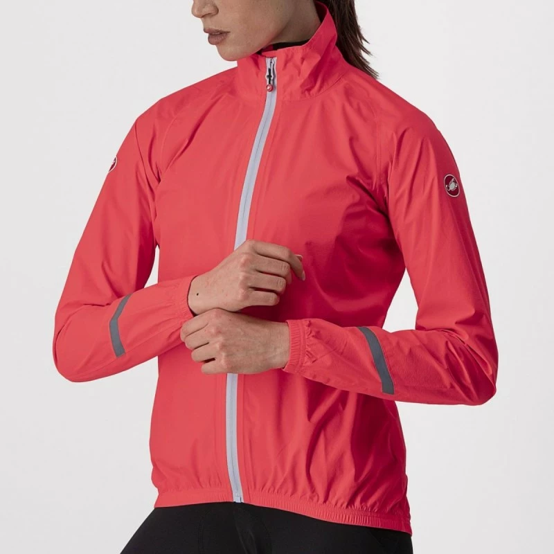 Comme son nom l’indique, nous avons voulu créer la veste de pluie d’urgence simple et idéale. Nous l’avons rendue complètement imperméable et compacte, et, comme vous pouvez l’attendre de Castelli, nous lui avons également donné un ajustement incroyable sur le vélo, tout en restant assez spacieux pour s’adapter à un Gabba. Elle possède tous les attributs d’une veste de pluie performante, avec une fermeture éclair imperméable, une longue queue, des manches longues et des fermetures de poignets qui peuvent aller sur des gants, mais nous savions que vous ne voudriez pas vous ruiner avec elle, donc le seul vrai compromis par rapport à nos offres haut de gamme est la respirabilité. Nous avons conservé un style sobre et ajouté une couleur vive, le rose brillant, pour que vous puissiez facilement l’utiliser comme veste de transport et rester élégant lorsque vous arrivez au bureau. Si vous comptez la porter par-dessus une tenue de bureau, il est préférable de prendre une taille au-dessus.